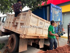 COSOLEACAQUE, VER. A 04 de noviembre de 2025.- La mañana de éste martes, un camión tipo volteo que transportaba gravilla, cayó en un socavon, en la calle Emiliano Zapata, esquina Correos del Barrio Cuarto de esta cabecera municipal, quedando atrapada también una unidad de conocida empresa refresquera.