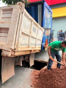 Aparentemente la unidad repartidora de refrescos había hecho un alto en la primera calle en mención, antes de llegar al cruce con la arteria Correos, el camión tipo volteo al rebasar, debido a la carga que llevaba, hizo que la losa de concreto hidráulico se quebrara y se originó el socavón.