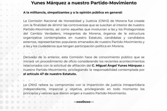 Se pronuncia Comisión Nacional de Honestidad y Justicia de Morena ante solicitud de afiliación de Miguel Ángel Yunes Márquez.