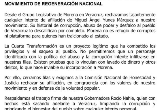 ¡No a la afiliación de Miguel Ángel Yunes Márquez!; rechaza Grupo Legislativo de Morena en Veracruz.