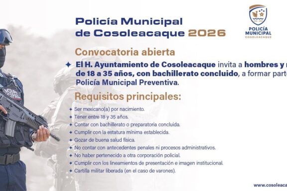 COMUNICADO. COSOLEACAQUE, VER. A 27 de febrero.- Con el firme compromiso de fortalecer la seguridad pública, el H. Ayuntamiento de Cosoleacaque convoca a hombres y mujeres con vocación de servicio a participar en el proceso de reclutamiento, selección, evaluación e ingreso a la Policía Municipal Preventiva, contribuyendo con responsabilidad, […]