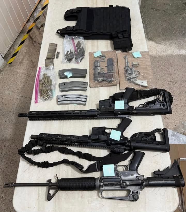 En el lugar de los hechos, los agentes federales aseguraron tres armas largas, dos armas cortas, 77 cartuchos útiles, tres cargadores y un chaleco táctico.
