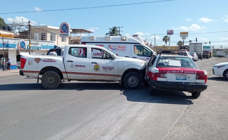 Un automóvil en la modalidad de taxi, marcado con el número económico 129 del municipio de Cosoleacaque y, una camioneta con razón social de la SEDESOL fueron los protagonistas de este percance vial.