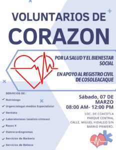 En esta campaña de Cultura Registral, el grupo Voluntarios de Corazón también estará presente con servicios médicos de: nutriologo, dentista, análisis clínicos, rayos x, electrocardiograma, así como barbería y belleza, en apoyo al Registro Civil de Cosoleacaque.
