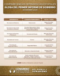 De esta manera inicia el ciclo de comparecencias: la Secretaría de Gobierno (Segob) el martes 18 de noviembre a las 10:00 horas ante la Comisión de Gobernación; ese mismo día a las 17:00 horas acudirá la Secretaría de Desarrollo Económico y Portuario (Sedecop), ante la Comisión Permanente de Corredor Interoceánico, Zonas Portuarias, Mejora Regulatoria y Desarrollo Económico.
