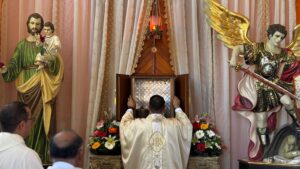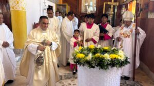 Durante la Sagrada Eucaristía, Mons. Sosa Canto exhortó a la comunidad a caminar en unidad y fortalecer la fe bajo la guía del Padre Senovio, destacando que la Iglesia vive y crece cuando sus miembros se sirven unos a otros con amor cristiano.