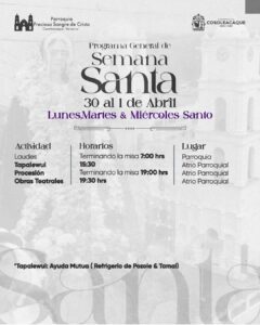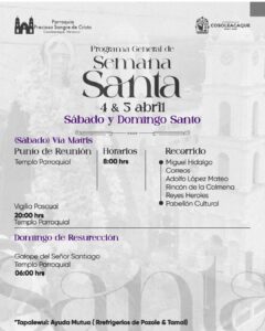 El Sábado Santo, a las 08:00 horas, se realizará el Vía Matris desde el templo parroquial, mientras que a las 20:00 horas tendrá lugar la Vigilia Pascual.