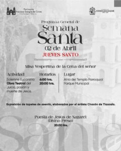 El Jueves Santo comenzará la elaboración de los tradicionales tapetes de aserrín, una expresión artística que se desarrollará sobre la calle Miguel Hidalgo y en el interior del recinto parroquial, donde los colores, la fe y la creatividad darán vida a impresionantes obras efímeras. Ese mismo día se celebrará la solemne eucaristía en el atrio, así como la representación del juicio, pasión y muerte de Jesús en el parque central Miguel Hidalgo.